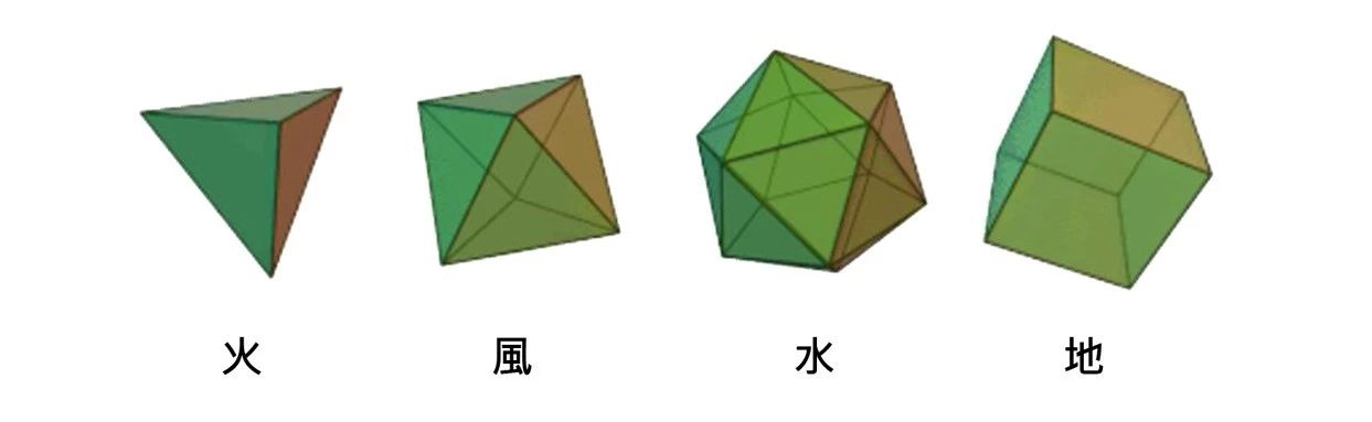 「元素」(希臘文:στοιχεῖον,拉丁文:stoicheia)西元前360年希臘哲學家柏拉圖提出,假設細微的物質有其幾何結構:正四面體(火),正八面體(風),正二十面體(水),及正六面體(地)。