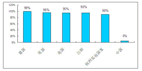 尽管中国新风系统近几年取得了稳定的发展,并且呈现出逐步上升的趋势,但相较于英国、美国、日本等发达国家,新风系统在中国的发展只能称得上是起步阶段。目前新风系统在欧美家庭的普及率已经高达90%以上;70年代起,西班牙90%的新建房子都安装上了新风系统;在英国、法国、德国等地,新风系统已经和建筑物融为一体。数据显示,我国新风系统市场普及率不足5%,相比欧美、日韩等,我国市场普及率还有较大提升空间。