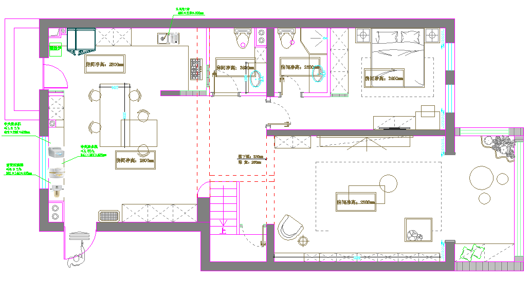 本方案地点在北京市大兴区。根据户主要求,设计师结合北京市环境、气候特点,对室内空气置换系统的设备选择、管路铺设等进行设计;根据室内房间面积大小的不同进行空调系统的设备配置;同时在厨房安装进口水处理设备,解决水质问题。