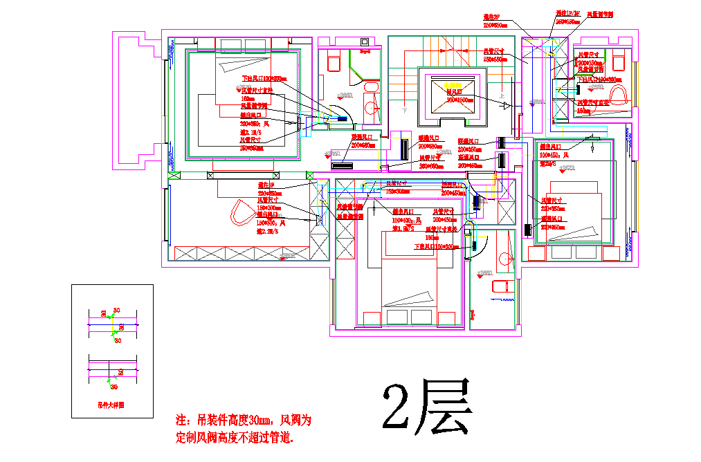 根据户主要求,设计师结合北京市环境、气候特点,对别墅全空气中央空调系统的设备选择、管路铺设等进行设计,确保全屋保持常年恒温、恒湿、恒氧、恒静、恒洁的室内环境。